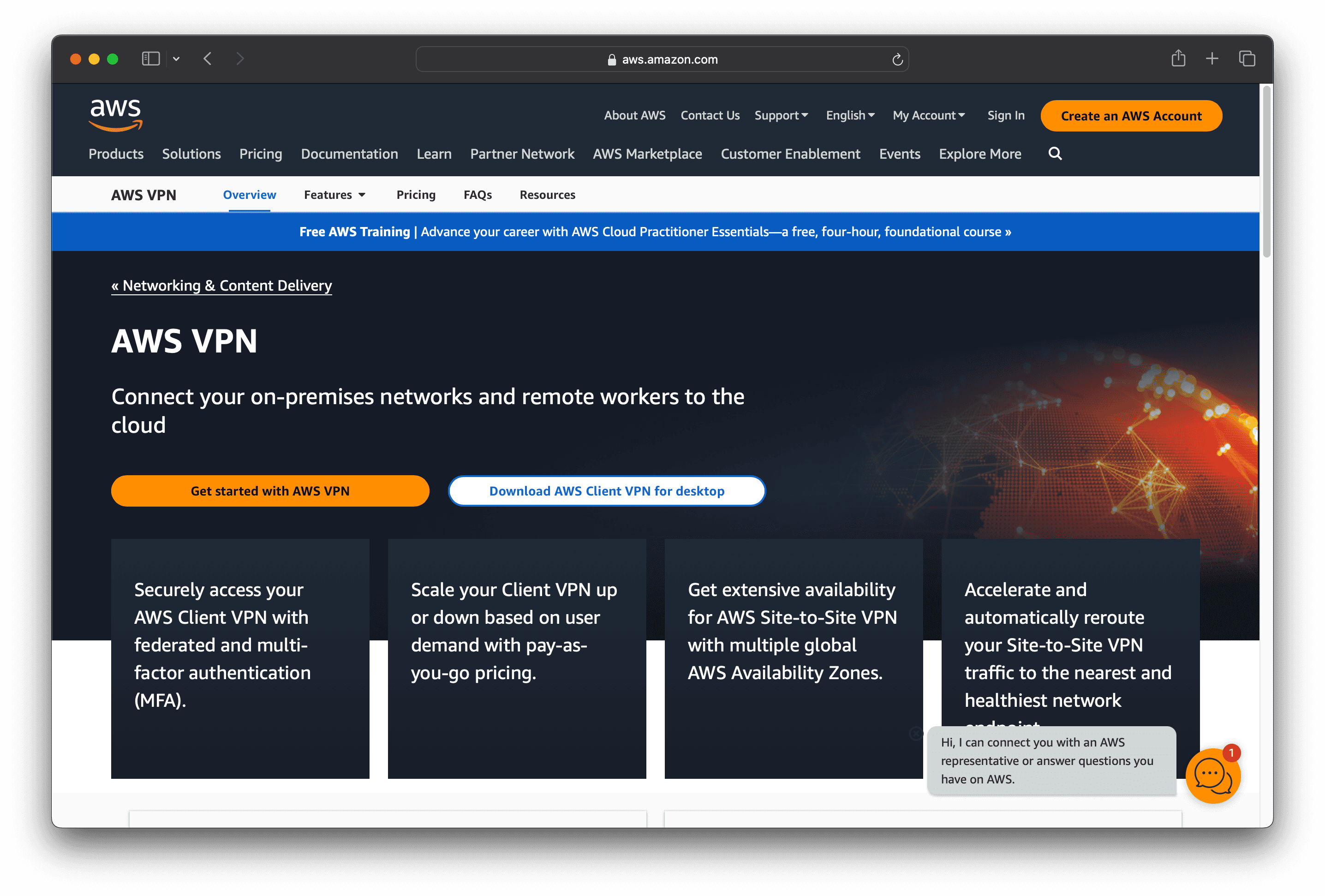 AWS VPN is a service by Amazon Web Services that securely connects on-premises networks and remote workers to the cloud. It offers both client and site-to-site VPN options, ensuring secure and scalable access to AWS resources. Designed for ease of use, AWS VPN integrates seamlessly with existing infrastructure.